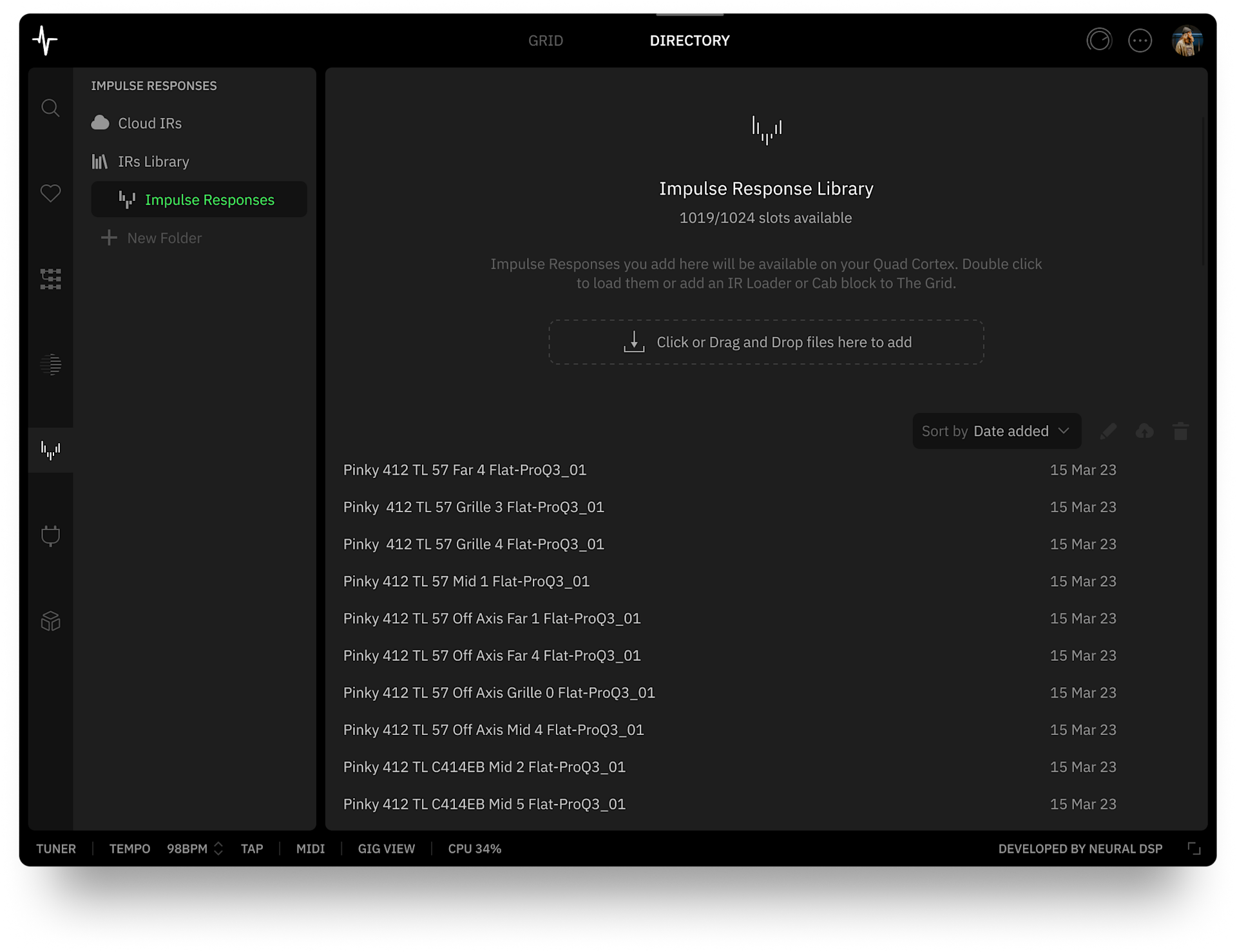 Adding IRs to your Quad Cortex or Cortex Cloud profile is streamlined with Cortex Control. Simply open your IR library and drag-and-drop your IRs into it. The IRs will be immediately available on your Quad Cortex or Cortex Cloud account, depending on which library you upload them to.